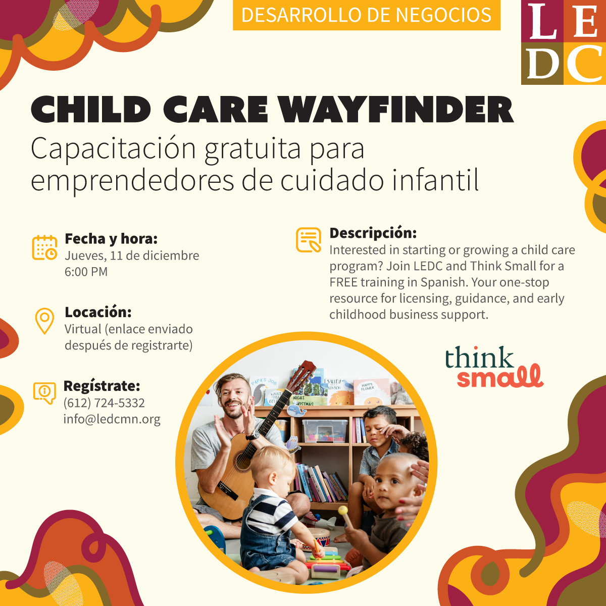 ¿Te interesa iniciar o hacer crecer un programa de cuidado infantil? Únete a LEDC y Think Small para una capacitación virtual GRATUITA en español, diseñada para emprendedores en el campo del cuidado infantil. Aprende cómo acceder a Child Care Wayfinder, un servicio integral que ofrece orientación sobre licencias, recursos y apoyo para propietarios de programas de primera infancia. Esta sesión es ideal para personas que desean abrir un programa de cuidado infantil o dueños actuales que buscan expandirse.