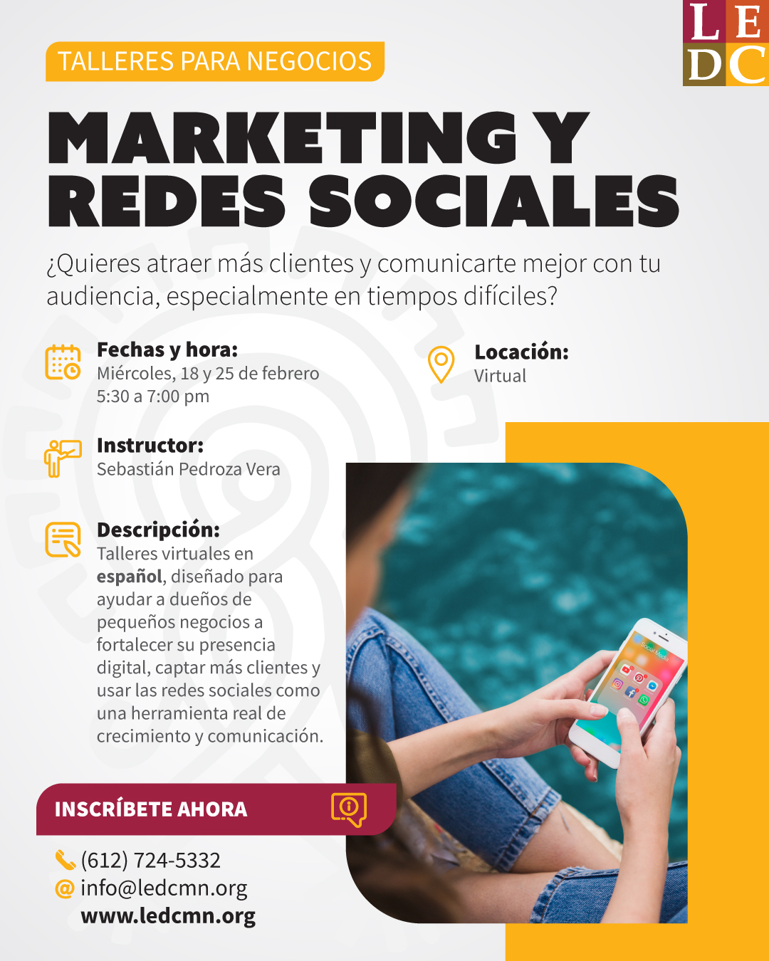 Acompaña a LEDC en este taller virtual gratuito en español, diseñado para ayudar a dueños de pequeños negocios a fortalecer su presencia digital, captar más clientes y usar las redes sociales como una herramienta real de crecimiento y comunicación.