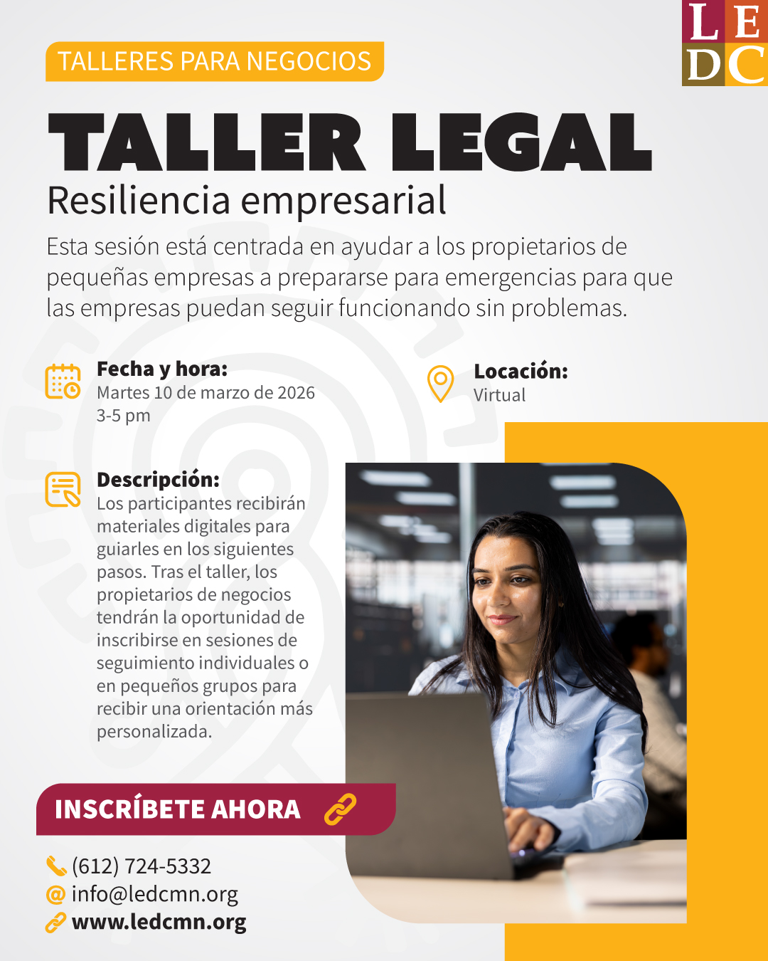 Únete al Centro de Desarrollo Económico Latino y a la Clínica de Inclusión Económica de la Mitchell Hamline School of Law para un taller virtual gratuito. Esta sesión está centrada en ayudar a los propietarios de pequeñas empresas a prepararse para emergencias para que las empresas puedan seguir funcionando sin problemas.