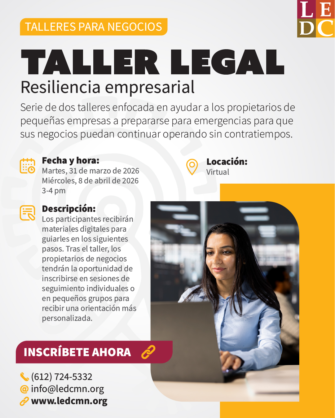 Únete al Centro de Desarrollo Económico Latino y a la Clínica de Inclusión Económica de la Mitchell Hamline School of Law para un taller virtual gratuito. Esta sesión, que forma parte de una serie de dos talleres, está enfocada en ayudar a los propietarios de pequeñas empresas a prepararse para emergencias para que sus negocios puedan continuar operando sin contratiempos.